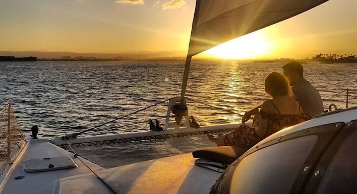 Our Ohana 2 is defined as “a yacht or other boat with twin hulls in parallel (imagine two separate big canoes joined together by a platform)” it is the most stable sailing experience you can get while still having a full sailing experience feeling the wind in your face and the fluid motion of the ocean. Equipped with a forward net to lay out, shaded area, spacious cabin in case of rain and full bathroom inside your comfort needs are met for a great sail!